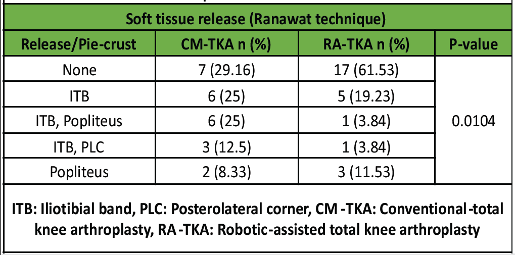 The soft tissue intervention was done according to the Ranawat technique in both cohorts. It was observed that the soft tissue intervention was extensively required in the CM-TKA group, whereas the RA-TKA cohort required less release with significance (P = 0.0104) (Table 4). The mean duration of surgery was almost similar in both cohorts.