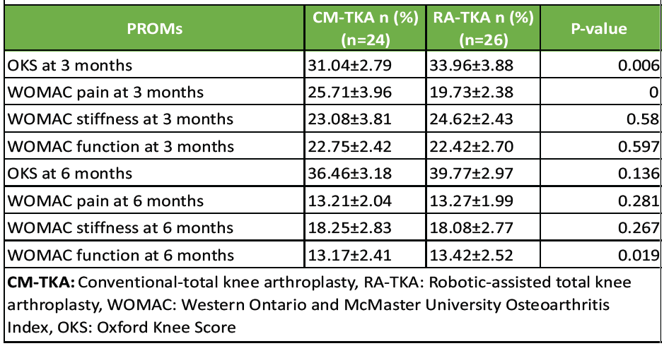 Results: The RA TKA cohort showed faster recovery than CM TKA patients. The RA TKA cohort required less soft tissue releases (P = 0.010). At the 3-month follow-up, there was a substantial reduction in pain in the RA TKA cohort (19.73 ± 2.38 vs. 25.71 ± 3.96, P = 0.000). However, over 6 months, pain reduction was found to be similar in both groups (13.27 ± 1.99 vs. 13.21 ± 2.04, P = 0.281). The improvement in OKS in RA TKA cohort was significant at 3 months (33.96 ± 3.88 vs. 31.04 ± 2.79, P = 0.006) and at 6 months (39.77 ± 2.97 vs. 36.46 ± 3.18, P = 0.136), and improved ROM in both groups (111.25 ± 13.29 vs. 116.96 ± 9.31, P = 0.083), with improvement in flexion (12.73 ± 5.85 vs. 7.08 ± 10.41, P = 0.210) in RA TKA compared to the CM-TKA cohort.
