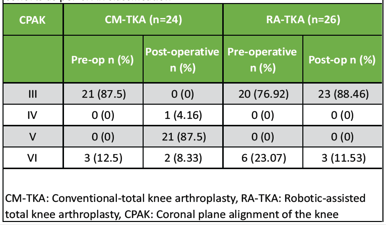 Table 6: Pre-operative and post-operative knee phenotypes in both cohorts as per CPAK classification