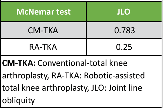 There was no significant difference in pre-operative CPAK classification between CM-TKA and RA-TKA. In CM-TKA, most cases had an altered phenotype, with only 8.33% inheriting the pre-operative phenotype. On the other hand, 88.46% cases inherited pre-operative phenotype in the RA-TKA cohort. Analysis of the change in proportion between pre-operative and post-operative phenotypes (McNemar test) is given in Table 7. The proportion of change in CPAK was very high in the CM-TKA cohort (P = 0.783) than RA-TKA cohort (P = 0.250).
