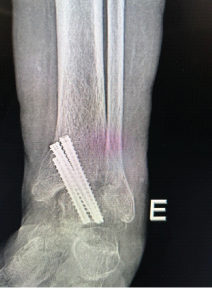 A 68-year-old male patient, a former smoker, obese with a body mass index of 41, and hypertensive, was diagnosed with severe acute respiratory syndrome coronavirus 2 infection in 2022, requiring prolonged hospitalization (45 days) in an intensive care unit. As an orthopedic sequela, he developed a rigid equinus deformity of the left ankle, resulting in impaired ambulation without the assistance of an ankle-foot orthosis with a heel wedge and a cane. After specialized orthopedic evaluation, surgical treatment consisting of Achilles tendon tenotomy and arthroscopic ankle arthrodesis was indicated. With the patient in the supine position under spinal anesthesia and sedation, the surgical procedure was performed in two stages: First, a posterior approach to the Achilles tendon approximately 4 cm proximal to its insertion was made, and, under direct visualization, the tenotomy was performed. Next, through standard anterolateral and anteromedial arthroscopic portals, anterior synovectomy and removal of the articular cartilage were carried out. Fixation for the ankle arthrodesis was achieved using three 6.5 mm diameter double-compression conical screws, all inserted medially (Fig. 1).