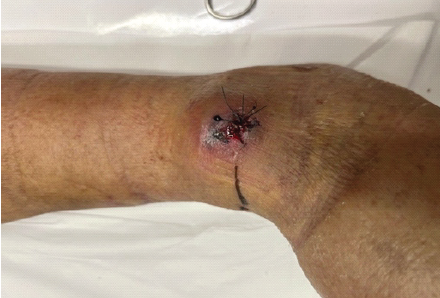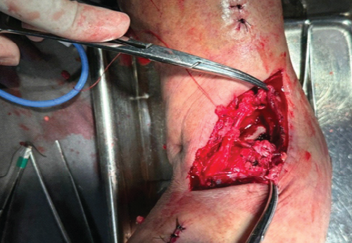 Figure 3: Ligation of the anterior tibial artery proximal and distal to the lesion.