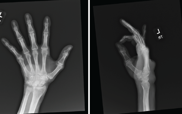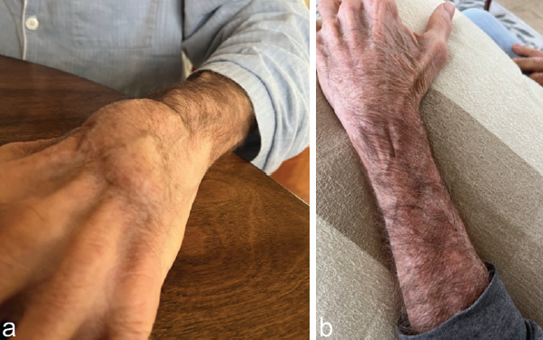 A 79-year-old male presented to our hand clinic in February 2024 for evaluation of a left dorsal hand mass (Fig. 1). Plain radiographs taken at presentation (Fig. 2 and 3) showed a small subchondral cyst and mild erosions at the distal radio-ulnar joint, along with the dorsal soft tissue swelling consistent with the clinical exam.
