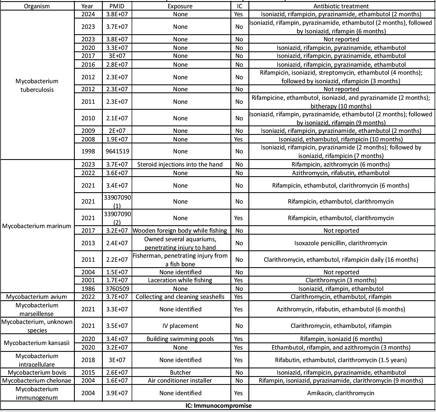 Table 1: Mycobacterial extensor tenosynovitis case reports