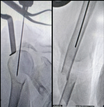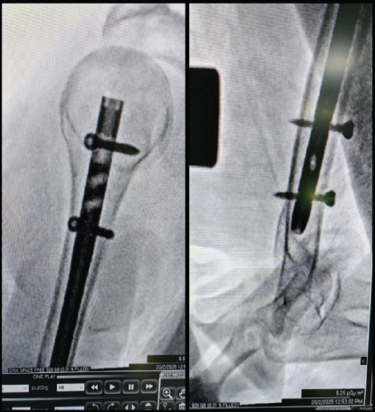 Reaming was carried out slowly and with low torque, to minimize the risk of cortical blowout in fragile bone. A nail of suitable length and diameter was introduced and its proximal end sunk flush with the articular surface, preventing impingement. Proximal fixation was secured with two divergent locking screws (Fig. 3). At the distal end, screws were placed in a single plane, a conscious choice to balance stability against the risk of excessive cortical perforation (Fig. 3).