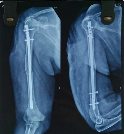 Case Report: We report the case of an 80-year-old female who sustained an isolated transverse mid-diaphyseal humerus fracture following a low-energy fall. Given the instability of the fracture configuration and apprehensions regarding adherence to bracing, we elected for surgical fixation utilising a locked intramedullary nail. A minimally invasive antegrade nail was employed with a deltoid-sparing incision. The nail was aligned flush to prevent shoulder impingement. Proximal and distal interlocking screws were used at both ends to guarantee torsional stability in osteoporotic bone. The patient exhibited remarkable radiological union and achieved nearly full range of motion through early mobilization and physiotherapy.