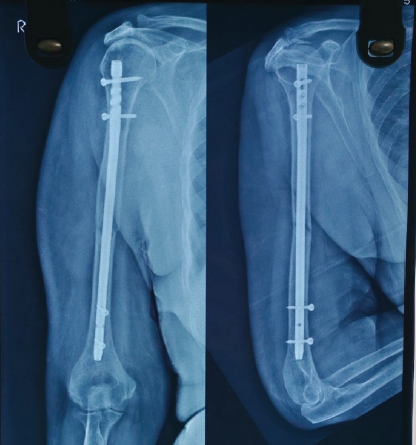 Fractures of the humeral shaft are common enough, yet the way they present can be very different across age groups. In the younger patient, high-energy trauma is the usual culprit, and the patterns we encounter are often transverse or short oblique. Among the elderly, on the other hand, low-energy falls against a background of osteoporosis usually give rise to spiral or comminuted configurations [2,3]. For that reason, the sharply transverse fracture we observed in this octogenarian stood out as distinctly uncommon and required us to think beyond routine management. Bracing has always been an attractive option for these fractures. The work of Sarmiento established its value, and for many years it remained the default [4]. But while functional bracing can serve well in the right setting, it does not lend itself to every fracture type. Transverse patterns, in particular, are rotationally unstable and have been repeatedly shown to carry higher risks of delayed or non-union when left to conservative care [1]. In addition, the success of bracing relies on muscle tone and patient cooperation, both of which are often compromised in older individuals. Denard et al. [5] noted that surgical fixation generally delivers better outcomes, while the randomized FISH trial reinforced what most practicing surgeons already recognize – bracing may eventually catch up, but surgery restores function earlier, and in the elderly, those months of lost mobility can be devastating [6]. Once the decision is made to operate, the debate typically shifts between plating and nailing. Plates provide excellent stability, but they do so at the cost of a wide exposure, soft-tissue stripping, and a recognized risk of radial nerve palsy [7,8]. Contemporary data also show a steady drift toward intramedullary fixation, reflecting both surgeon preference and broader evidence [9]. Several reviews [10,3] suggest that unstable configurations, especially transverse fractures in older patients, are more reliably managed with surgical fixation rather than prolonged immobilization. Locked antegrade intramedullary nailing has gained ground because it preserves biology, reduces operative blood loss, and lowers the risk of infection [11,12,13]. Meta-analyses confirm that union rates are at least comparable to plating and, in many cases, superior [12,13]. Yet the technique is not without its pitfalls. Furuhata et al. [14] reminded us that poor cuff handling or a prominent nail can leave the patient with lasting shoulder dysfunction. For that reason, we were meticulous: The deltoid was spared, the cuff was split in line with its fibers and repaired carefully, and the nail was buried flush with the articular surface to prevent impingement. Osteoporotic bone always tests the surgeon’s judgment. In this case, reaming was performed with a deliberate, low-torque technique to avoid cortical blowout. Proximally, divergent screws were selected to maximize hold, while distally, we chose single-plane interlocking. Although biomechanical studies favor multiplanar locking, in fragile cortices, it can do more harm than good by creating stress risers. By limiting perforations, we struck a balance between stability and biological preservation [3,10]. This construct gave us the confidence to mobilize the patient early, a step that in itself may be as important as the fixation. Early movement prevented the cascade of pulmonary decline, deconditioning, and loss of independence that prolonged immobilization so often triggers [3,7]. Retrograde nailing was considered but set aside. Its value is clear in distal third fractures, but for a mid-diaphyseal pattern, it offers no distinct advantage. In fact, antegrade nails provide more predictable alignment and stability, and allow the procedure to be performed in the supine position – a safer and more practical choice for an elderly patient [11,15]. This case, then, is not simply about the rarity of a fracture pattern. It is about tailoring decisions to the individual in front of us. By selecting antegrade nailing over bracing or plating, avoiding retrograde entry, and applying a series of small but deliberate technical refinements, we achieved not just fracture union but meaningful restoration of function in an octogenarian who might otherwise have faced prolonged disability.