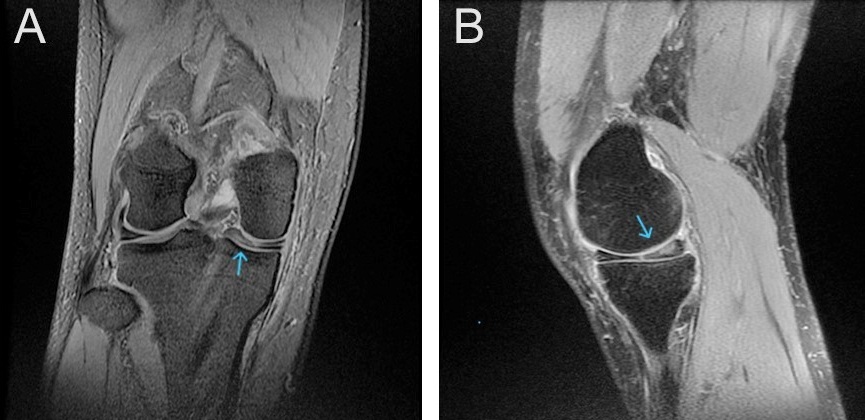 Magnetic resonance imaging (MRI) of the right knee demonstrates a medial discoid meniscus with increased thickness and abnormal morphology. A horizontal tear is identified, characterized by a linear hyperintense signal extending parallel to the tibial plateau. In addition, a complex tear involves the posterior horn, with irregular signal changes extending to the articular surface on T2-weighted images (Fig. 2).