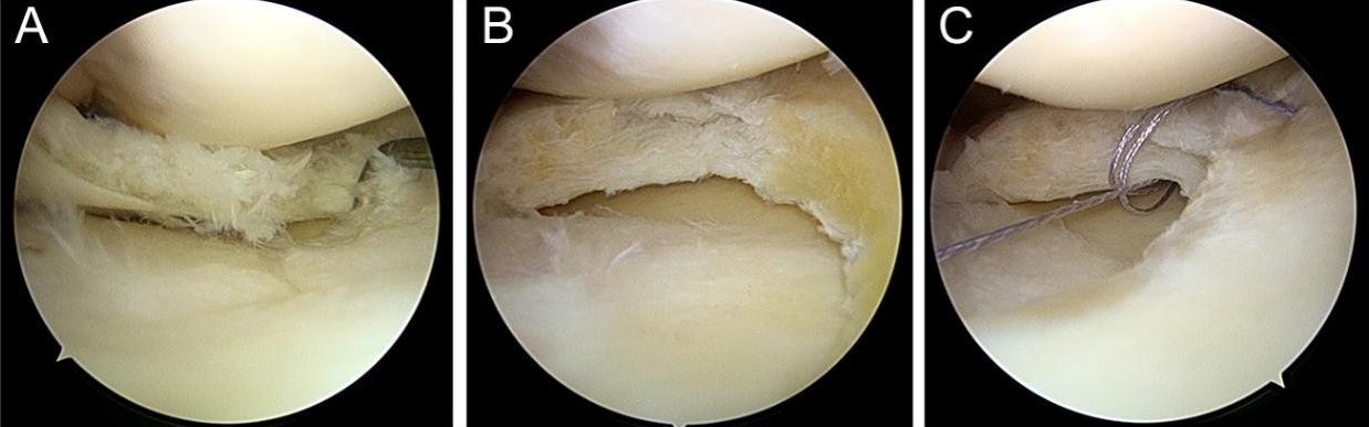 Figure 3: Arthroscopic findings of right knee: (a) incomplete-type discoid medial meniscus with complex posterior horn tear. (b) Partial meniscectomy with saucerization. (c) All-inside sutures repairing radial and horizontal tears.