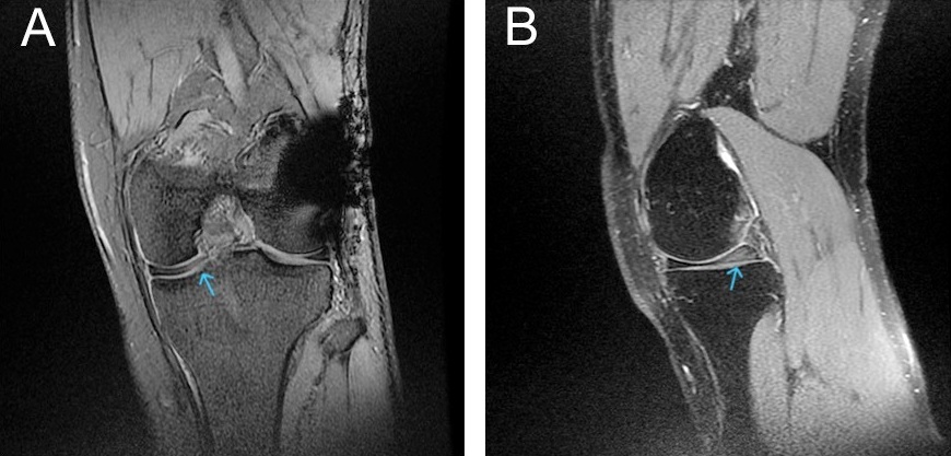 Figure 4: Coronal (a) and sagittal (b) T2-weighted magnetic resonance imaging of the left knee showing an incomplete medial discoid meniscus with intrasubstance degeneration signals (arrow).