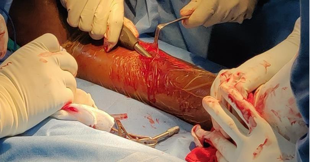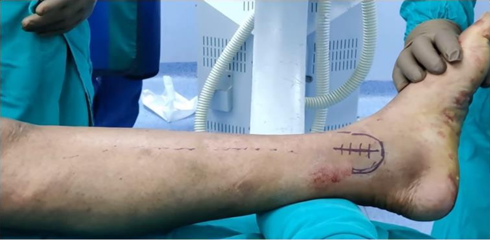 Eligible participants were adults aged between 20 and 70 years presenting with AO/OTA type 43-A2, 43-A3, or 43-C3 fractures, including Gustilo-Anderson Grade I open injuries, provided they were medically fit for anesthesia. Patients with pathological fractures, higher-grade open fractures, previously malunited fractures, prior surgery to the distal tibia, or severe systemic comorbidities precluding anesthesia were excluded. This selection ensured a relatively homogeneous cohort, isolating the outcomes of the MIPPO technique from confounding factors such as extensive contamination or severe comminution, consistent with recommendations from the Journal of Bone and Joint Surgery and Clinical Orthopaedics and Related Research [12]. Ethical clearance was obtained from the institutional ethics committee (Institutional Ethics Committee Approval No: 002/SBMCH/IHEC/2024/2113, Date: February 14, 2024), and written informed consent was obtained from all participants for inclusion in the study and for publication of anonymized clinical details and images. All patients underwent thorough clinical evaluation with standard anteroposterior and lateral radiographs of the leg and ankle, while computed tomography (CT) scans were performed when intra-articular extension was suspected, in accordance with accepted surgical planning protocols [13]. Fractures were classified using the AO/OTA system. All procedures were carried out by the same trauma unit according to a standardized protocol. Patients were placed supine on a radiolucent table under spinal or general anesthesia. A 3–5 cm anteromedial incision was made over the distal tibia (Fig. 1), with careful preservation of the saphenous vein and nerve. A submuscular extraperiosteal tunnel was created (Fig. 2) to maintain soft tissue integrity and periosteal circulation.