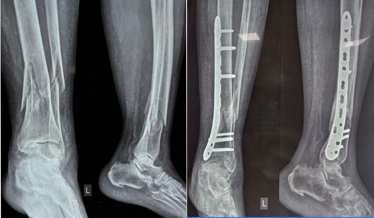 Fractures of the distal tibia are among the most complex and demanding injuries encountered in orthopedic trauma, accounting for approximately 7–10% of all lower limb fractures and notable for their challenging anatomy, tenuous soft tissue cover, and high risk of complications [1]. These injuries most often result from high-energy trauma such as road traffic accidents and falls from height, although in elderly osteoporotic patients, even minor torsional forces may produce similar fractures [2]. The distal tibia transitions from a tubular diaphysis to a flared metaphysis composed primarily of cancellous bone, making it biomechanically unstable. The plafond transmits nearly 90% of body weight during ambulation, and even subtle incongruities in reduction may predispose to post-traumatic arthritis and long-term disability [3]. In addition, its relatively poor periosteal blood supply makes it vulnerable to delayed or non-union, particularly when extensive dissection further compromises vascularity, highlighting the importance of soft tissue preservation in management [4].