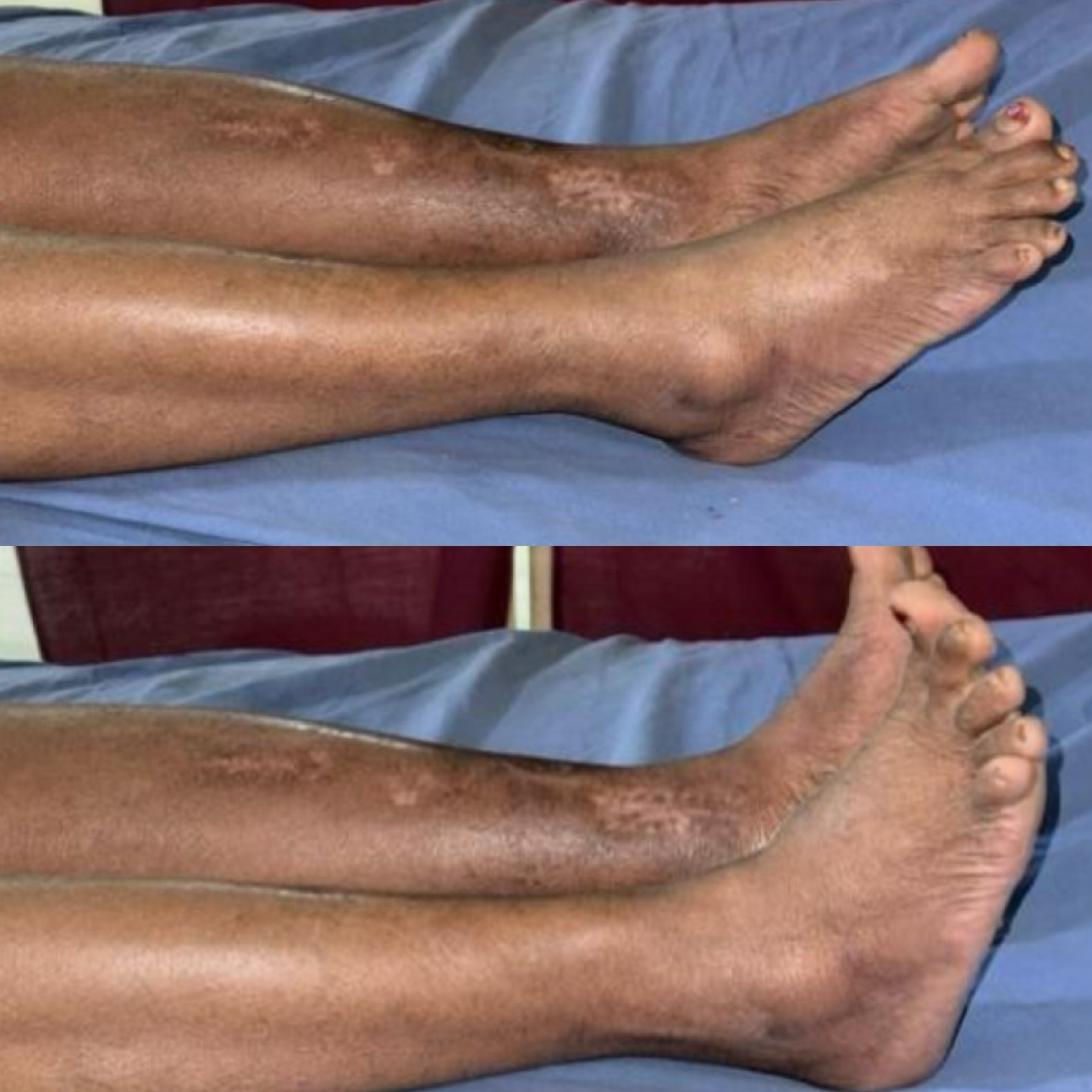 Figure 5: Dorsiflexion and plantar flexion – clinical image at 1-year follow-up of AO43A3 fracture.