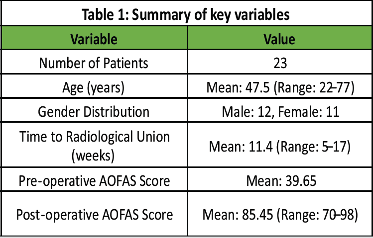 Results: The mean patient age was 47.5 years; 65% of injuries were from road traffic accidents. The mean radiological union time was 11.4 weeks (range 5–17). Mean AOFAS scores improved from 39.6 preoperatively to 82.9 at 6 months and 87.7 at 12 months (P < 0.0001), with 90% achieving good-to-excellent outcomes. Complications included delayed union in three cases (13%), one superficial infection (4.3%), and one mild varus malunion (4.3%), all resolving without reoperation. There were no deep infections, implant failures, or non-unions.