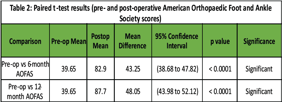 Table 2: Paired t-test results (pre- and post-operative American Orthopaedic Foot and Ankle Society scores)