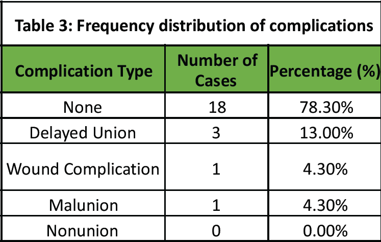 Statistical analysis demonstrated a negative correlation between time to union and functional recovery (Pearson’s r = –0.41, P < 0.05), suggesting that patients who achieved earlier healing tended to report better functional outcomes (Table 5). Regression analysis indicated that fracture type (extra- versus intra-articular) and mechanism of injury had a modest predictive influence, though limited by sample size.
