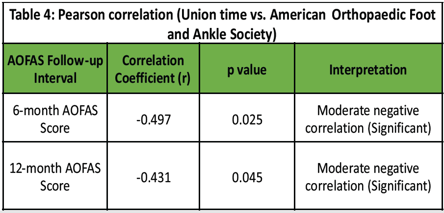 Table 4: Pearson correlation (Union time vs. American Orthopaedic Foot and Ankle Society)