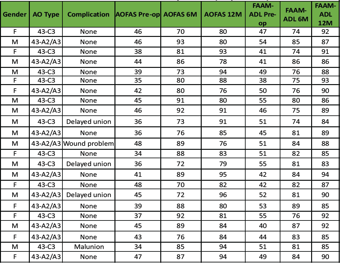 The primary outcome was functional recovery measured by the American Orthopaedic Foot and Ankle Society (AOFAS) Ankle-Hindfoot score, a validated system developed by Kitaoka et al. that integrate pain, function, and alignment [15]. In addition, the foot and ankle ability measure (FAAM) was employed as a patient-reported outcome tool, consisting of separate subscales for activities of daily living and sports. The FAAM has been validated as a reliable and responsive patient-reported outcome measure in ankle and distal tibial trauma [16]. This dual assessment ensured that both surgeon-based and patient-centered recovery parameters were captured. All intraoperative and post-operative complications, including delayed union, malunion, nonunion, wound problems, implant failure, and reoperation, were recorded. Descriptive statistics were used to summarize patient demographics and clinical outcomes. The normality of data distribution was checked, paired t-tests were applied to compare pre- and post-operative AOFAS scores, Pearson correlation was used to assess the relationship between union time and functional outcome, and linear regression was employed to explore predictors of recovery. These statistical methods are consistent with established practices in orthopedic outcome research and have been employed in prior studies published in injury and the Journal of Orthopaedic Trauma [17].