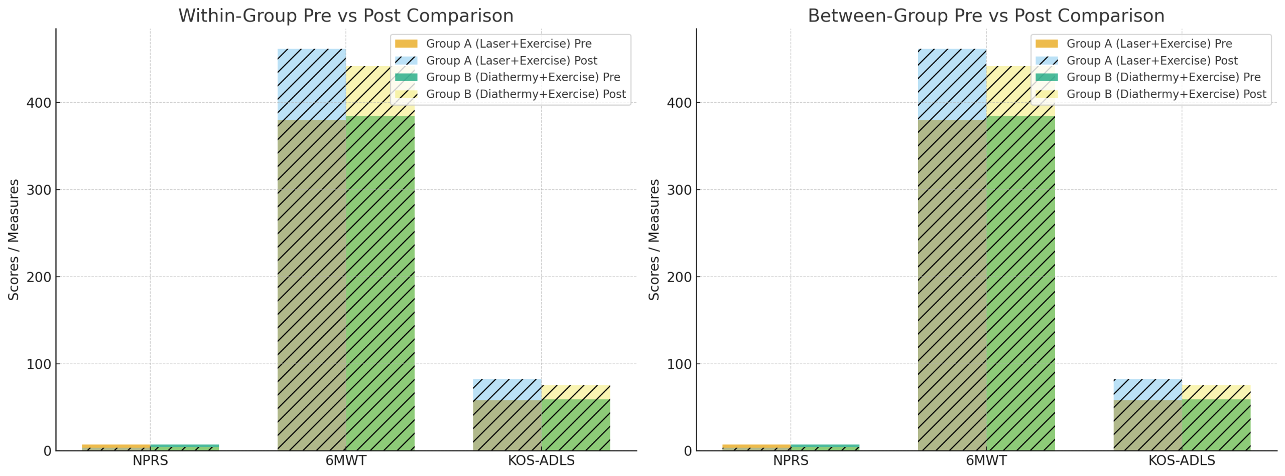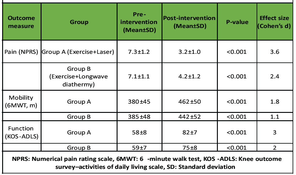 Results: Both groups showed statistically significant improvements across all outcomes post-intervention. However, Group A (exercise + laser therapy) demonstrated greater reductions in pain, longer walking distances on the 6MWT, and superior functional scores on the KOS-ADLS when compared to Group B.