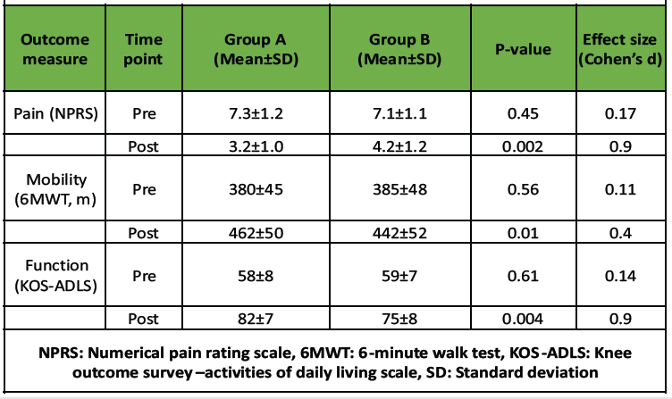 A total of 60 participants completed the study (Group A: n = 30; Group B: n = 30). Baseline demographics and clinical characteristics (age, gender, BMI, pre-intervention NPRS, 6MWT, KOS-ADLS) were comparable between groups (P > 0.05) (Tables 1 and 2).