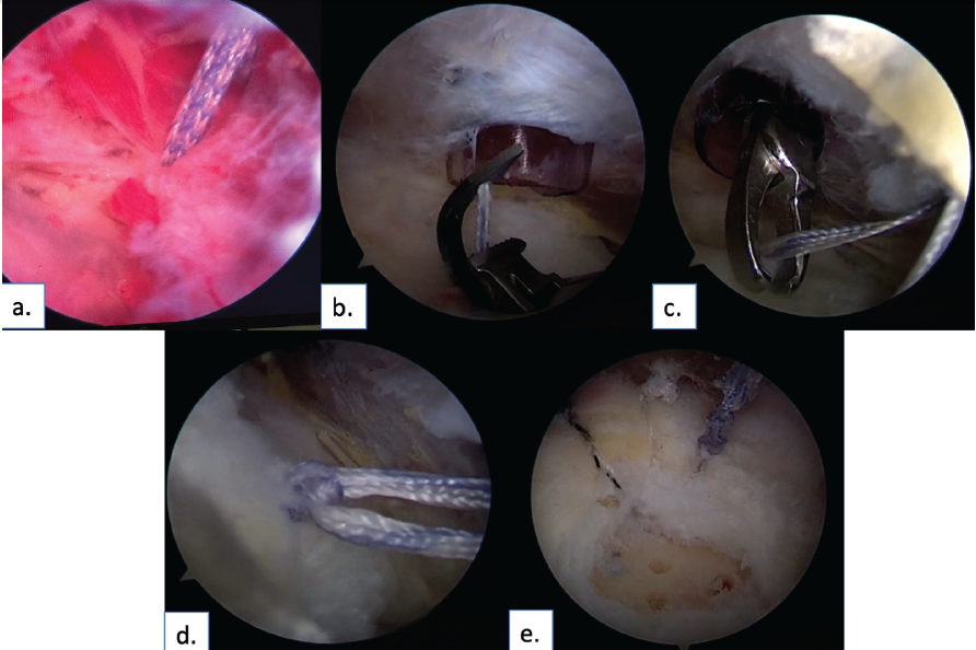Figure 1: Showing surgical technique/arthroscopic images of single row rotator cuff repair step-wise in one of our patients. (a) Anchor placed on rotator cuff footprint, (b) Use of Scorpion to pass suture bite through the cuff, (c) Retrieving of suture, (d) tying of knot via knot pusher (e). Final arthroscopic repair image.