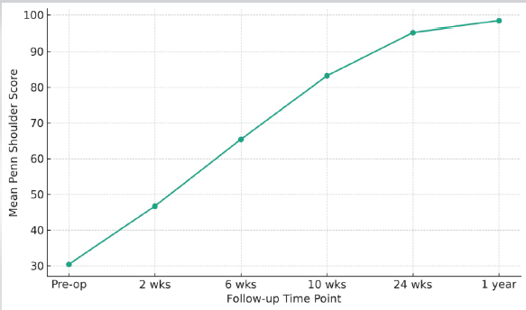 Figure 2: Trajectory of PENN shoulder score improvement post-rotator cuff repair. Most functional gains occurred within the first 3–6 months.