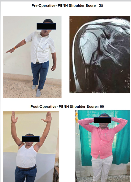 Postoperatively, patients were immobilized in a sling for 4–6 weeks, allowing only pendulum exercises initially. Passive and assisted range-of-motion exercises began after 1 week. Active motion commenced from 6 to 8 weeks, and strengthening exercises were introduced at 10–12 weeks. All patients followed a structured, supervised physiotherapy program.