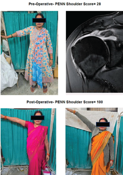 Figure 4: 39-year-old female patient presented with a right shoulder full-thickness supraspinatus tear after a fall injury. She experienced progressive shoulder pain for a year, difficulty in dressing and lifting objects, and had failed physiotherapy. Her pre-operative PENN Shoulder score (PSS) was 28, and magnetic resonance imaging showed full full-thickness supraspinatus tear. Single-row arthroscopic repair was done. Final follow-up up- showing excellent outcome with a PSS of 100.