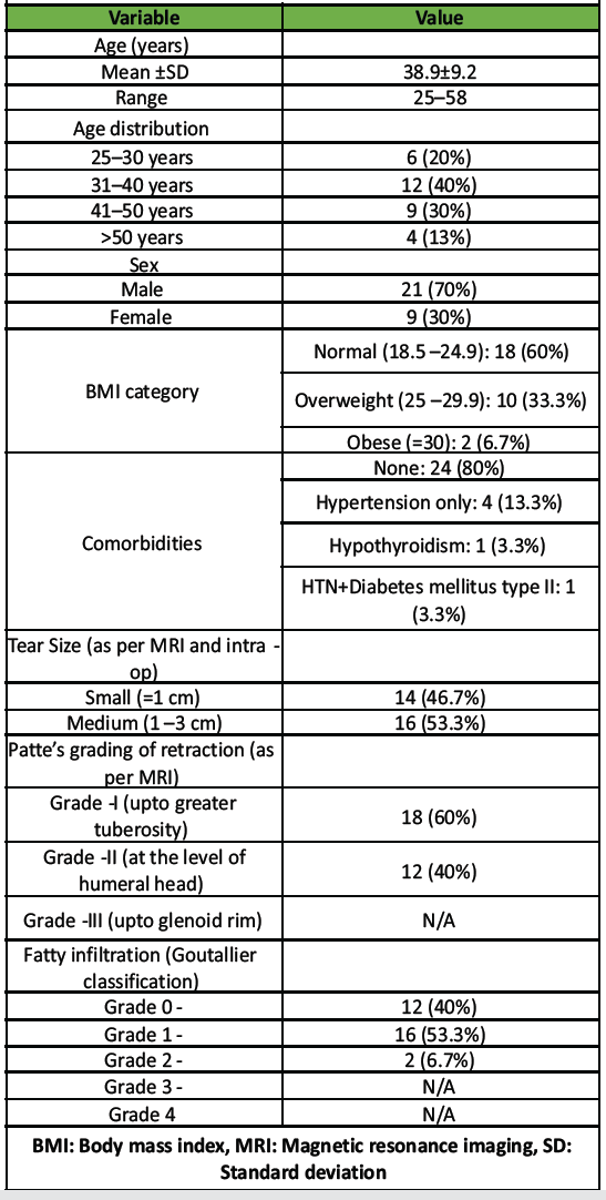 The mean age of the cohort (n = 30) was 38.9 ± 9.2 years (range: 25–58), with the majority (70%) being male. The most common age group was 31–40 years (40%). Right shoulder involvement (dominant side) was seen in 60% of patients. The average body mass index was 24.1 kg/m², and 80% had no comorbidities. Hypertension was present in 13.3%, while only one patient each had hypothyroidism or diabetes. All patients had imaging-confirmed small (46.7%) or medium (53.3%) full-thickness supraspinatus tears. Detailed demographics are provided in Table 1.
