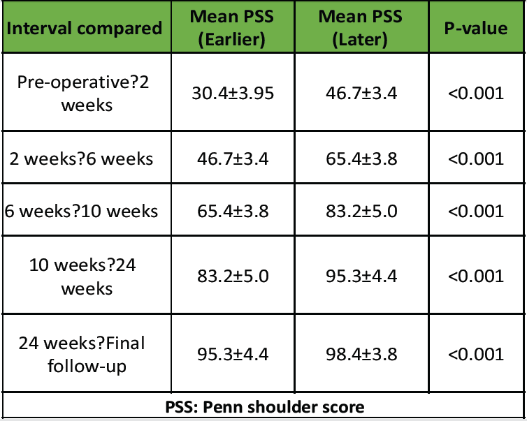 The PSS improved significantly across all time points. The pre-operative mean score was 30.4 ± 3.95, rising to 98.4 ± 3.8 at the final follow-up (~12 months, P < 0.001). Substantial gains were observed as early as 2 weeks (mean: 46.7), progressing to 65.4 (6 weeks), 83.2 (10 weeks), and 95.3 (24 weeks). Each interval demonstrated statistically significant improvement from the previous one (P < 0.001). Full PSS comparisons are shown in Table 2 and Fig. 2.This indicates that nearly all patients attained minimal pain, high satisfaction, and full or near-full shoulder function after their rotator cuff repair and rehab program.