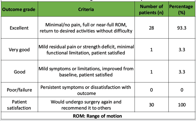 At final follow-up, an outcome grading was assigned based on each patient’s overall shoulder function and comfort. Twenty-eight patients (93.3%) achieved an “Excellent” outcome, meaning they had little to no pain, a full range of motion (or only slight, non-limiting deficits), and had returned to their desired activities without difficulty. Of the remaining two patients, one (3.3%) had a “Very Good” outcome and one (3.3%) a “Good” outcome – these patients had mild residual pain or strength deficit but were still satisfied and much improved from baseline. Importantly, no patient had a poor outcome or failure. These results indicate a very high success rate for arthroscopic single-row repair in this cohort. In terms of patient-reported satisfaction, all 30 patients stated that they would undergo the surgery again and recommend it to others, given the improvement they experienced (Table 3).