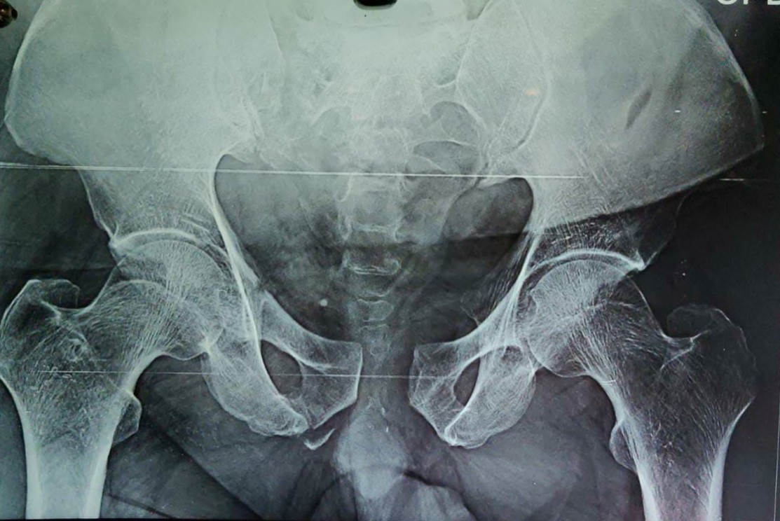 Figure 1: Right sacral ala fracture (Dennis type 2) and pubic diastasis with right anterior column fracture.