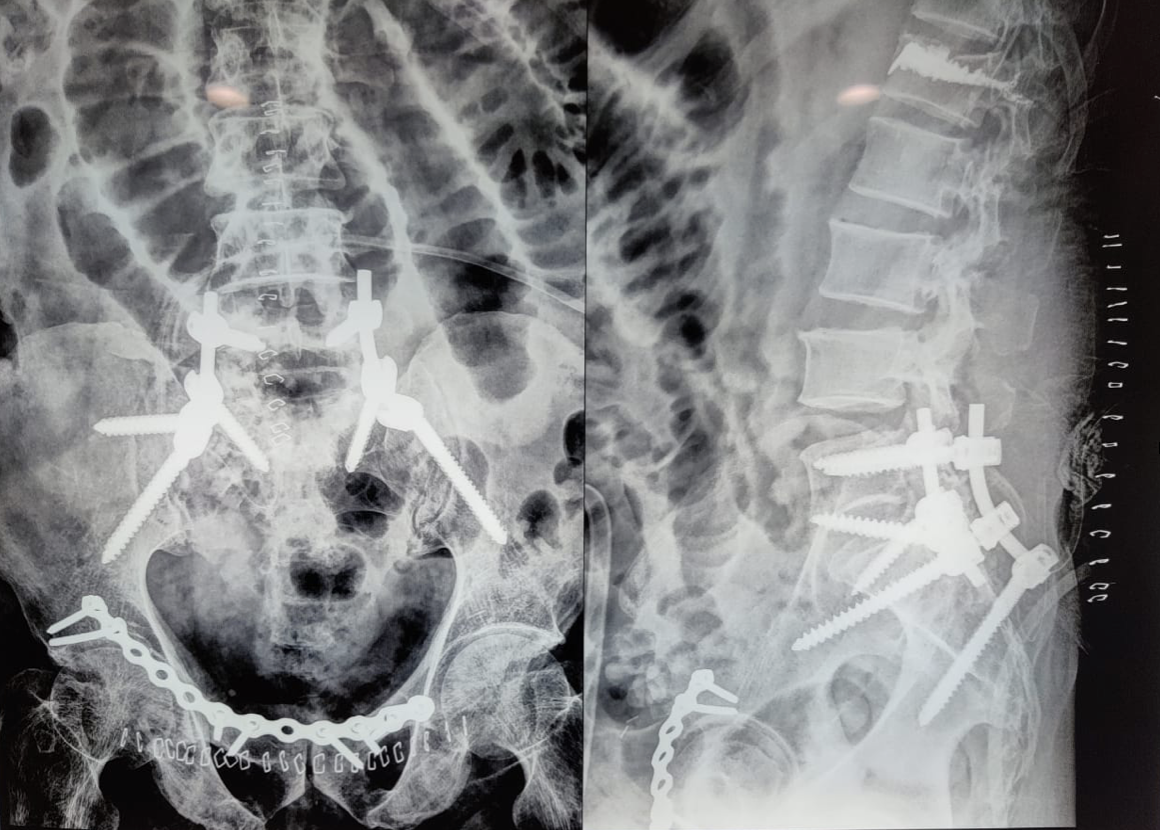 Figure 2: Post-operative X-ray of lumbopelvic fixation (L5-Iliac); L1 vertebroplasty; Right acetabulum anterior column open reduction internal fixation with 14-hole Recon plate.