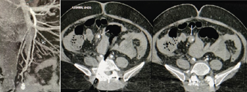 Figure 3: Contrast-enhanced CT scan shows the pseudoaneurysm (white arrow) in one of the distal branch of the superior mesenteric artery