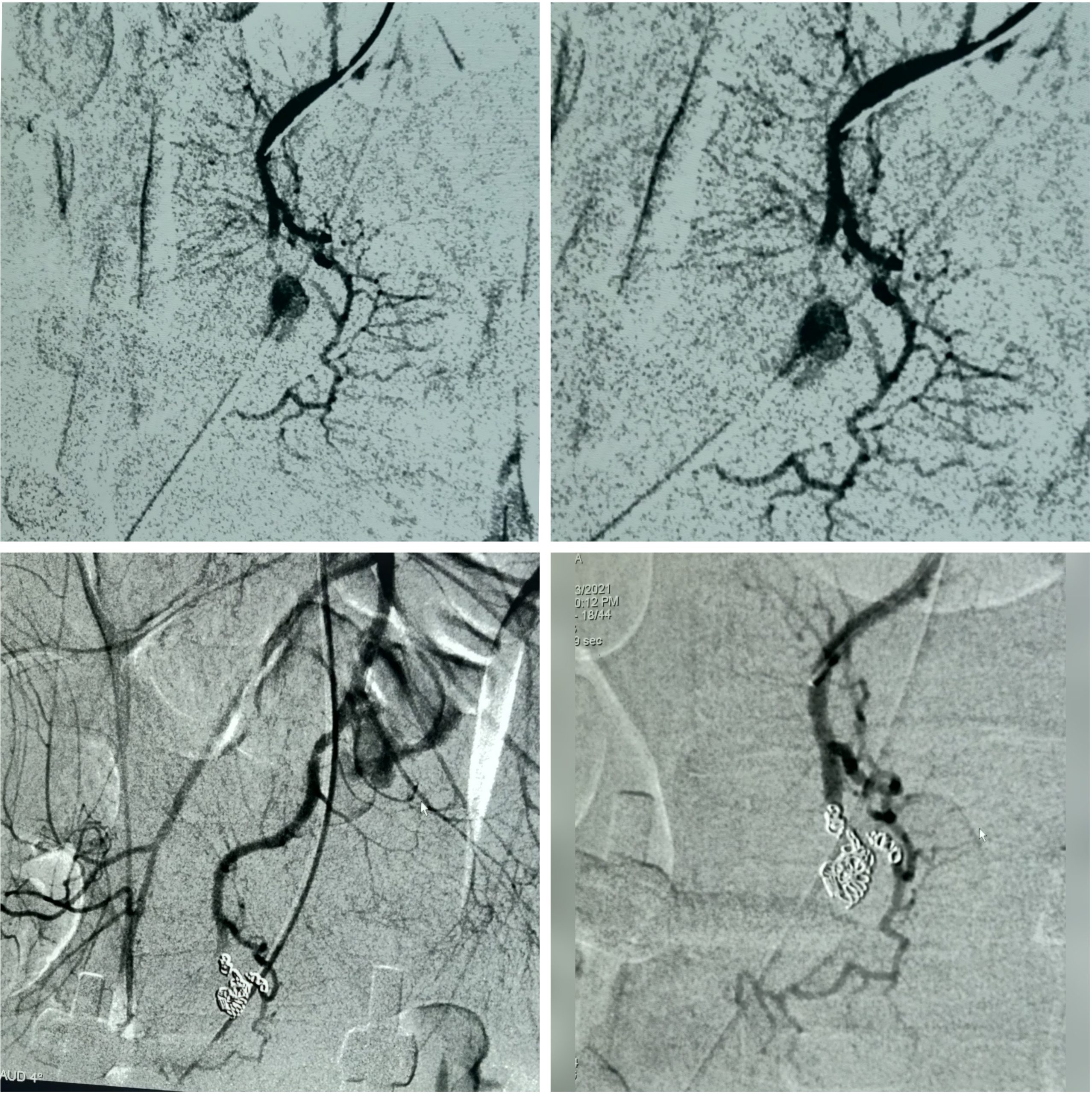 An urgent digital subtraction angiography confirmed the pseudoaneurysm, and selective catheterization of the affected artery was performed, followed by embolization using micro-coils. Post-procedure, the patient showed marked improvement, and hemoglobin levels were restored through multiple transfusions (Fig. 4).