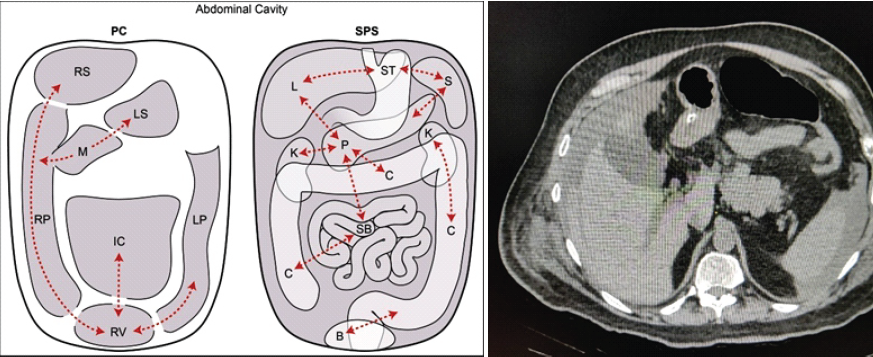 Figure 5: The peritoneal cavity (PC) versus the subperitoneal space (SPS). This is a schematic diagram showing the PC on the left and the SPS on the right. Dotted lines show some of these interconnections which allow for disease spread. Abbreviations: IC: Inframesocolic compartment, LP: Left paracolic recess, LS: Lesser sac, M: Morison’s pouch, RP: Right paracolic recess, RS: Right subphrenic space, and RV: Rectovesical space, B: Bladder, C: Colon, K: Kidney, L: Liver, P: Pancreas, S: Spleen, SB: Small bowel, and ST: Stomach [10].