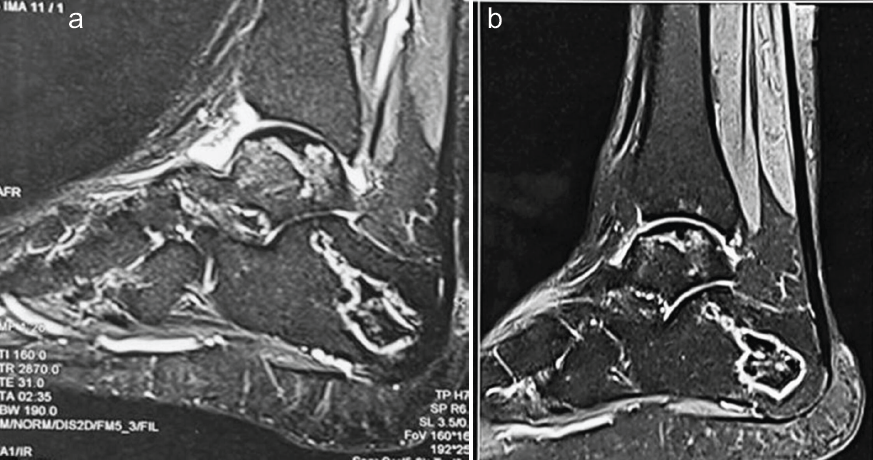 Figure 3: Pre-operative magnetic resonance imaging both ankles. 1.5 T. Proton density fat saturation sagittal images showing irregular, serpiginous hyperintensities in bilateral calcaneum, navicular, and talus (right (A) > left (B)), suggestive of bone infarcts with maintenance of contours of talar domes, calcanei, and tali.