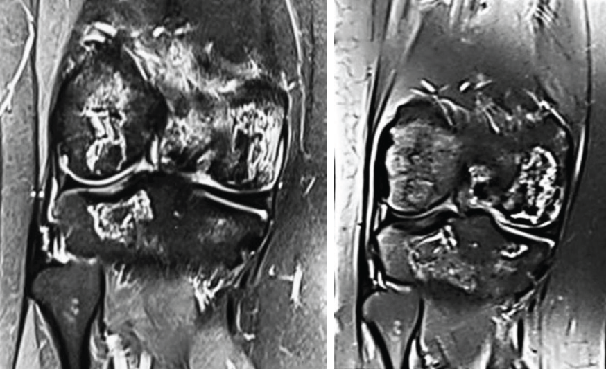 Figure 4: Pre-operative magnetic resonance imaging both knees. 1.5 T. Proton density fat saturation Coronal images showing irregular, serpiginous hyperintensities in both knees involving distal femur and proximal tibia (Right (A) > Left (L)), suggestive of bone infarcts with maintenance of contour of bilateral distal femur and proximal tibia.