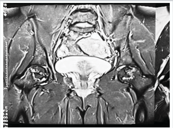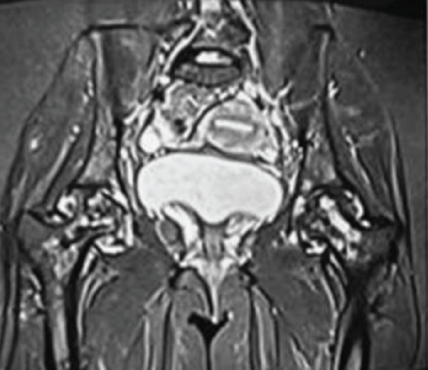 Figure 2: Pre op MRI both hips. 1.5 T. Short tau inversion recovery coronal image showing ill defined geographic hyperintensities (right > left) in femoral head, femoral contour, and joint space maintained. Suggestive of avascular necrosis of both femoral heads (Ficat-Arlet II) (Right > Left).