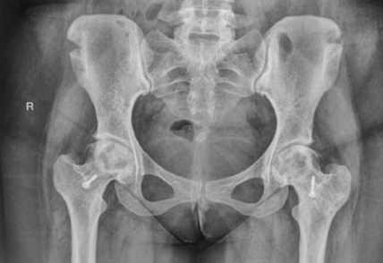 Figure 6: Digital X-ray of pelvis with both hips showing avascular necrosis of both femoral heads operated with tensor fascia lata muscle pedicle graft.