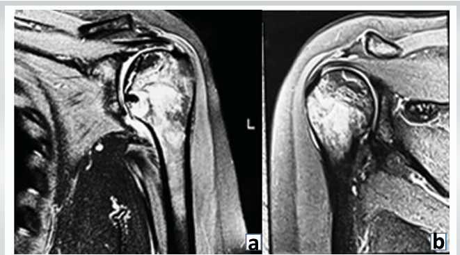 Figure 1a & b: Pre-operative magnetic resonance imaging both shoulders. 1.5. T. Proton density (PD) fat saturation, coronal images showing irregular, serpiginous PD hyperintensities in proximal humerus, Left (a) > Right (b), humerus contour and joint space maintained. Suggestive of avascular necrosis of both humeral heads (Cruess-II).