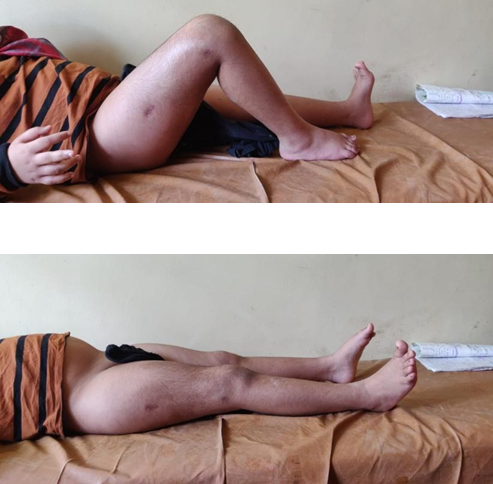 Traction was applied using a fracture table with the help of fluoroscopic guidance to reduce the fracture. Appropriately sized elastic nails of 2–3.5 mm diameter were selected. Elastic nails were bent in an even curve. The tip of the nail was further bent 2 cm from one end at an angle of 40°. This helps the nail to bounce off the opposite cortex into the canal rather than break it. After skin incision, insertion points were made one on the medial and another on the lateral side of the distal femur, 2 cm proximal to the distal epiphyseal plate. Elastic nails were pushed right up to the fracture site. Then one of the nails was passed across the reduced fracture site, which was followed by the second nail. The nails were directed in such a way that the medial nail was introduced into the neck and the lateral just below the trochanteric apophasis in a fan-shaped manner. Two divergent nails provide adequate fixation and stability in the adolescent femur [11,12]. The distal end of the nail should never project beyond the distal epiphyseal plate on IITV to prevent knee pain and problems of nail protrusion, and care should be taken to avoid pending the distal end of nails. Knee bending and quadriceps exercises were begun as soon as the patient could tolerate them. Non-weight bearing ambulation was started within first few days, though partial weight bearing was permitted only after radiological evidence of callus formation. Full weight bearing was allowed only on radiological evidence of a firm union (Fig. 2, 3, 4).