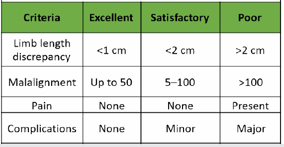 This was a prospective study conducted at Krishna Institute of Medical Sciences, Karad. The study was approved by the Institutional Ethics Committee of Krishna Institute of Medical Sciences, Karad. Written informed consent was obtained from parents/guardians and assent from children when appropriate. Thirty children with femoral fractures managed with TENs were included in this study. Patients were followed up till 12 months postoperatively for limb length discrepancy, pelvic asymmetries, rotational deformity, axial angulation, and hip and knee range of motion. Scoring criteria for TEN by Flynn et al. [11] were used and results were classified as excellent, satisfactory, or poor (Fig. 1).