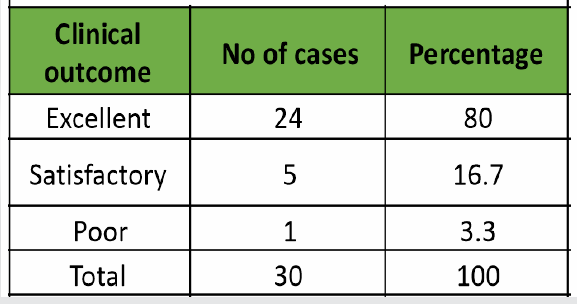 Ages of children ranged from 4 to 14 years (mean 8 years). There were 19 boys and 11 girls. 25 of the cases had fractures due to a fall from height, and 5 due to a road traffic accident. The mean duration of surgery was 50 min, and the average hospital stay was 7 days. All patients were available for evaluation after 12 months of follow-up. Radiological union was achieved in an average time of 7 weeks. Full weight bearing was achieved in a meantime of 7 weeks. As per the Flynn et al.’s [11] criteria, the results were excellent in 24 patients, successful in 5, and poor in 1 patient. One patient had varus angulation, 3 patients had entry site irritation, and 2 had limb length discrepancy. Functional range of movement was achieved within a mean duration of 8 weeks. Out of 30 cases, 10 had spiral fractures, 5 had oblique fractures, 8 had transverse and 7 had comminuted fractures. No post-operative difference was observed due to fracture pattern; hence, this signifies remodeling of the bone in this age group (Table 1, 2, 3, 4).