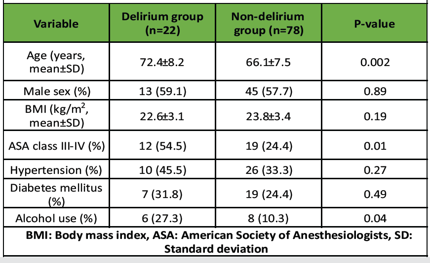 The mean age of patients who developed delirium was significantly higher compared to those without delirium (72.4 ± 8.2 years vs. 66.1 ± 7.5 years; P = 0.002). The proportion of males was comparable between the two groups (59.1% vs. 57.7%; P = 0.89). Although body mass index did not differ significantly (P = 0.19), patients with higher ASA class (III-IV) were more frequently observed in the delirium group (54.5% vs. 24.4%; P = 0.01). Hypertension and diabetes were not significantly associated with delirium, whereas alcohol consumption was more prevalent among patients who developed delirium (27.3% vs. 10.3%; P = 0.04) (Table 1).