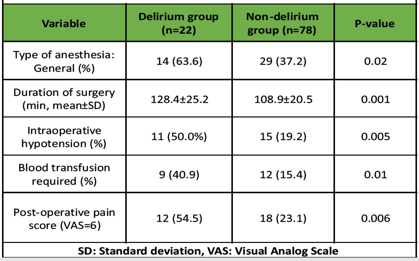 Patients who developed delirium were more likely to have received general anesthesia compared to regional anesthesia (63.6% vs. 37.2%; P = 0.02). The mean duration of surgery was significantly longer in the delirium group (128.4 ± 25.2 min) compared with the non-delirium group (108.9 ± 20.5 min; P=0.001). Intraoperative hypotension was also observed more frequently among delirious patients (50.0% vs. 19.2%; P = 0.005). The requirement for perioperative blood transfusion was significantly higher in the delirium group (40.9% vs. 15.4%; P = 0.01). Post-operative pain scores (visual analog scale ≥ 6) were also significantly elevated in patients with delirium (54.5% vs. 23.1%; P = 0.006) (Table 2).