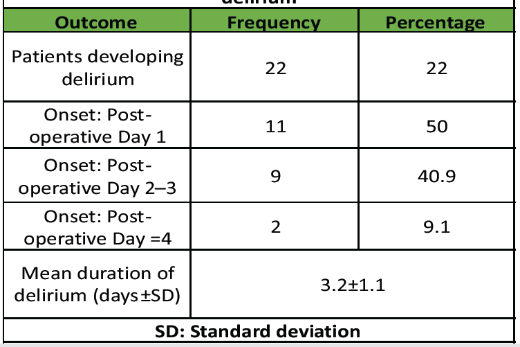 Delirium most commonly presented on the 1st post-operative day (50.0%), followed by the 2nd or 3rd post-operative day (40.9%). Only a small proportion developed delirium after the 4th post-operative day (9.1%). The mean duration of delirium was 3.2 ± 1.1 days (Table 3).