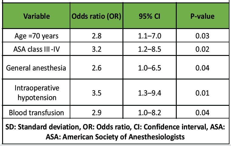 On multivariate logistic regression analysis, age ≥ 70 years (odds ratio [OR] 2.8, 95% confidence interval [CI]: 1.1–7.0, P = 0.03), ASA class III-IV (OR 3.2, 95% CI: 1.2–8.5, P = 0.02), general anesthesia (OR 2.6, 95% CI: 1.0–6.5, P = 0.04), intraoperative hypotension (OR 3.5, 95% CI: 1.3–9.4, P = 0.01), and requirement for blood transfusion (OR 2.9, 95% CI: 1.0–8.2, P = 0.04) emerged as independent predictors of POD (Table 4).