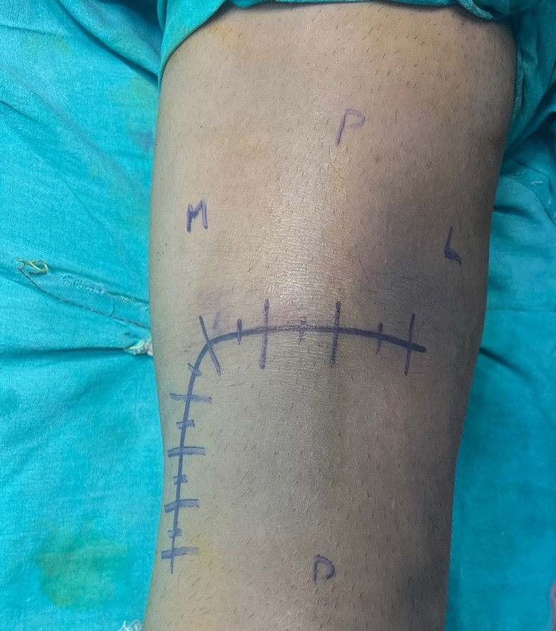 Given the complexity of the fracture and the associated PCL avulsion, the decision was made to proceed with ORIF through a posterior approach to address both injuries. Under spinal anesthesia and additional sedation, the patient was placed prone on the operating table. In order to maximize access to the posterior aspect of the knee, the affected limb was placed on a padded bolster. This arrangement minimized strain on the neurovascular structures while enabling direct visualization of the fractures. A reverse L-shaped incision was taken by the posterior approach, starting above the popliteal crease and running vertically down the midline before curving medially (Fig. 3).