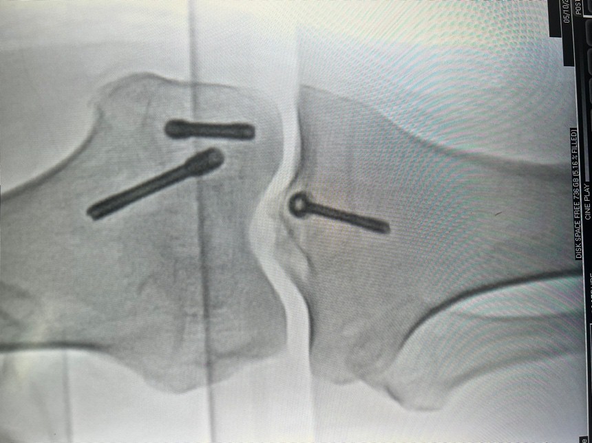 This opposing screw configuration provided robust fixation, and intraoperative fluoroscopy was used to ensure accurate alignment and the adequacy of fracture reduction.